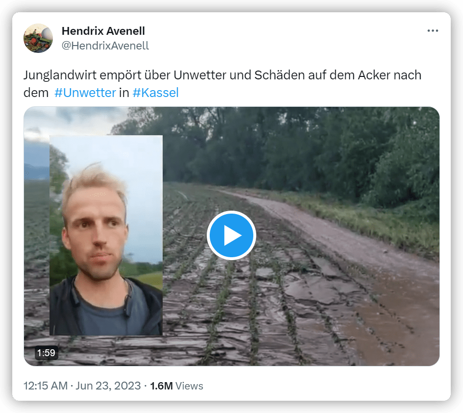 Und Motivation braucht es, wenn man die erste Person bei etwas sein möchte. Motivation und Mut, denn viel kann falsch laufen. Viel läuft bereits falsch. Viele neue Herausforderungen kommen schnell auf Landwirt:innen zu. Eine Woche nach unserem Besuch teilte Hendrik Allhoff-Cramer ein Video von seinem überfluteten Acker, welches über 1,6 Millionen Mal aufgerufen wurde. Noch nicht mal die Ausbildung zum Landwirt abgeschlossen und jetzt schon extrem besorgt über die eigene Zukunft und die Zukunft aller anderen Menschen.
