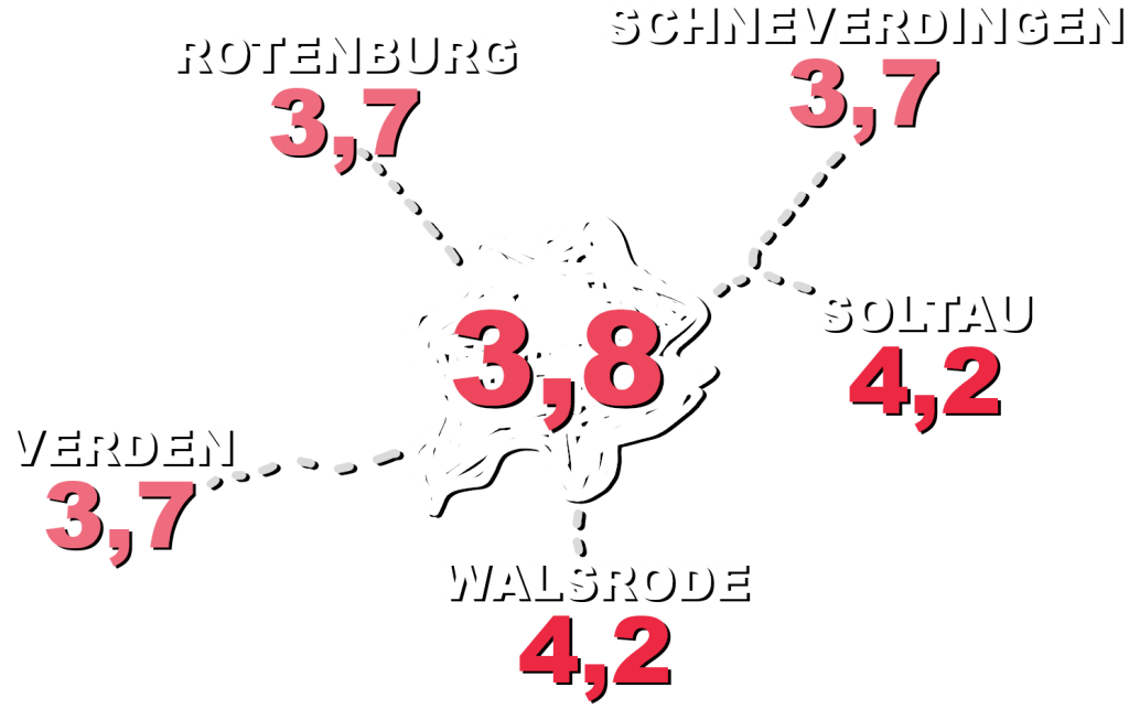 Visselhövede fällt in die Ortsgrößenklasse bis 20.000 Einwohner:innen. Hier belegen wir den Platz 168 von 423. Also die obere Hälfte. Was aber auch daher kommt, dass die Ergebnisse fast überall noch zu wünschen übrig lassen. Niedersachsen hat insgesamt ebenfalls nur eine 3,8 und ganz Deutschland liegt noch darunter mit einer 3,92 – was aber immerhin eine Verbesserung zur 3,96 aus 2022 ist.